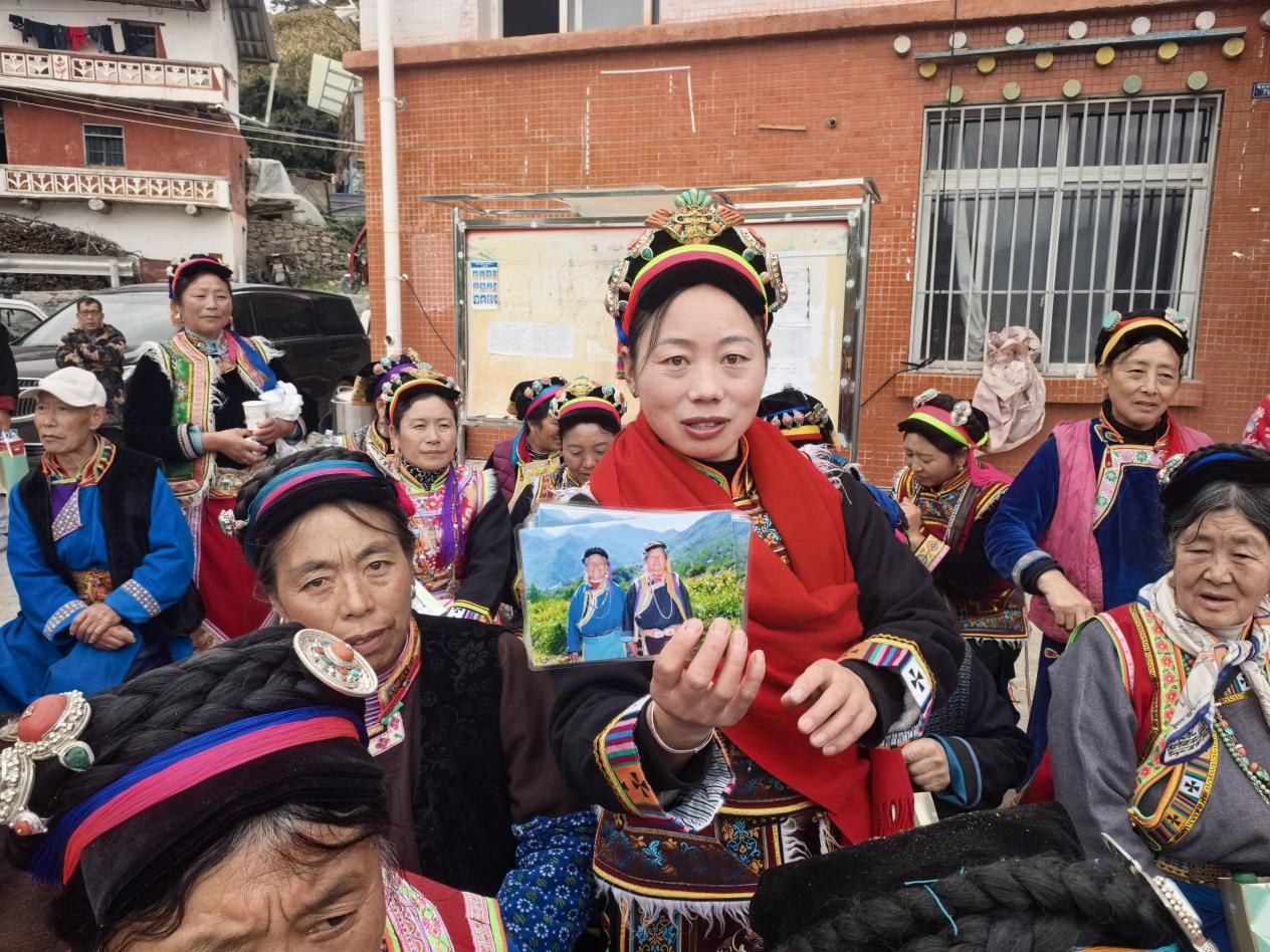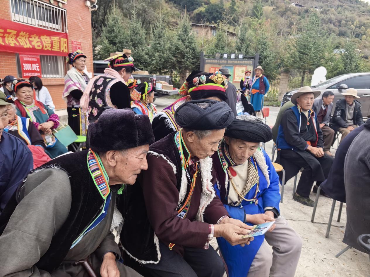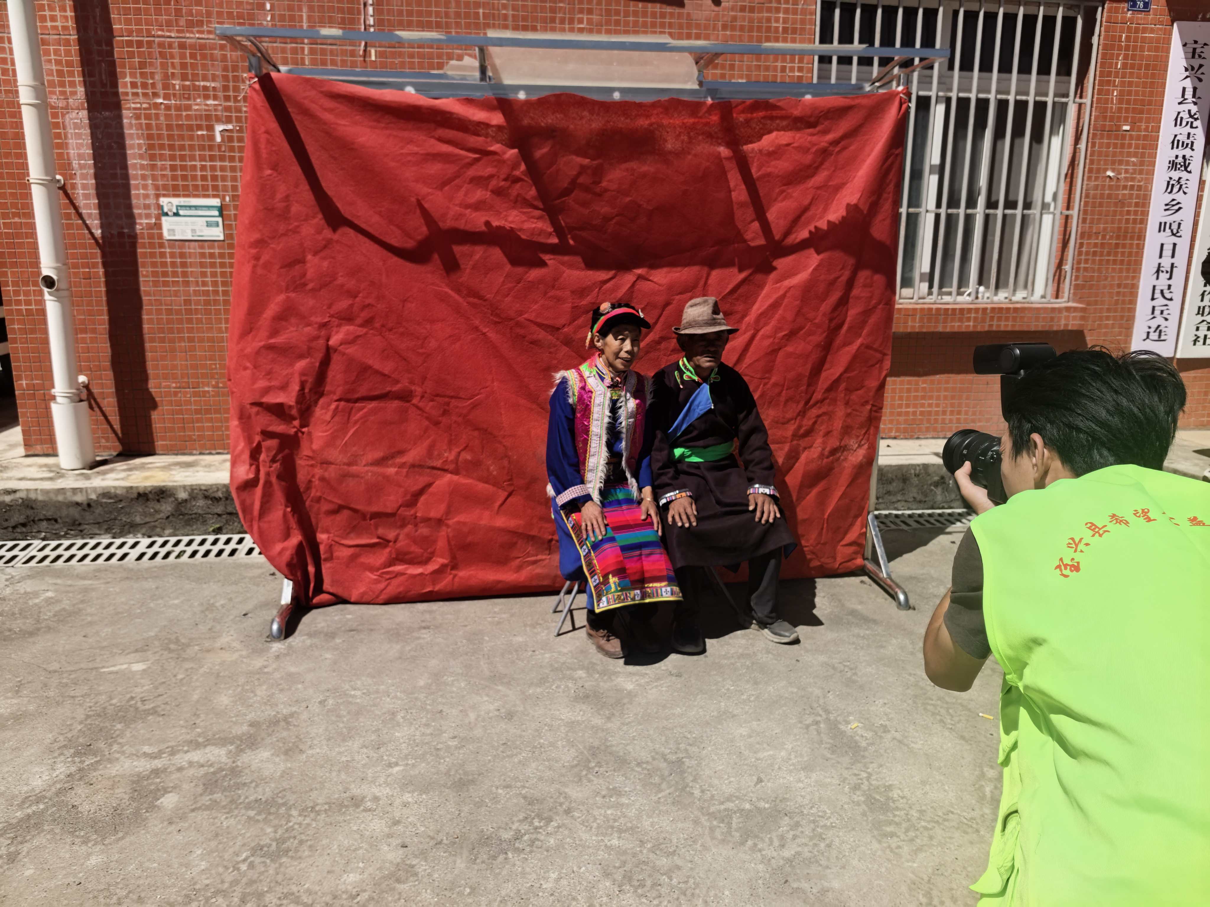 前期走访发现,村内多数老人因早年条件所限,未能留存结婚照或夫妻合影,成为心中遗憾。项目组提前一个月开展筹备工作:摸排并确定32户有补拍需求的老人;提醒老人要穿上民族盛装、协调摄影团队,选定村委会广场等具有村落特色的拍摄场景。提前采购老人用的带凳子的手杖及医用急救包等物品。
