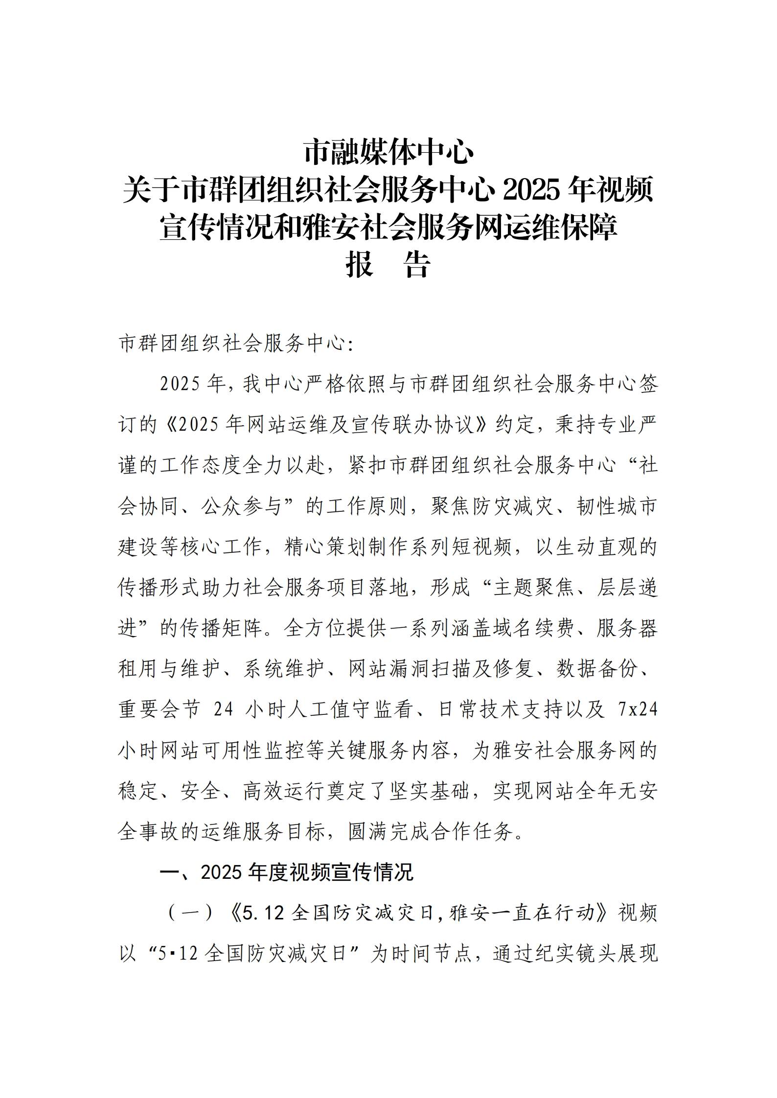市融媒体中心关于市群团组织社会服务中心2025年视频宣传情况和雅安社会服务网运维保障报告