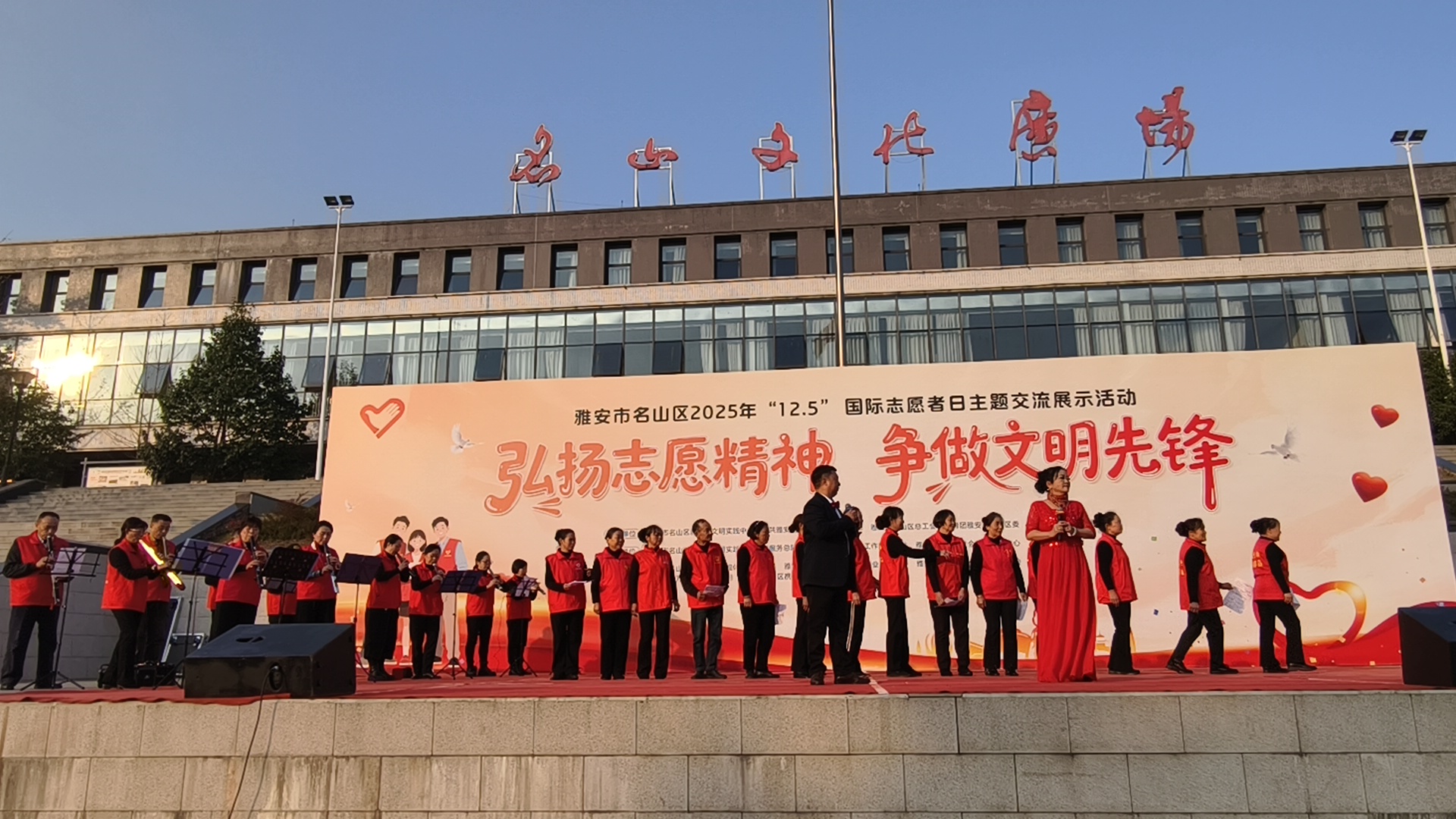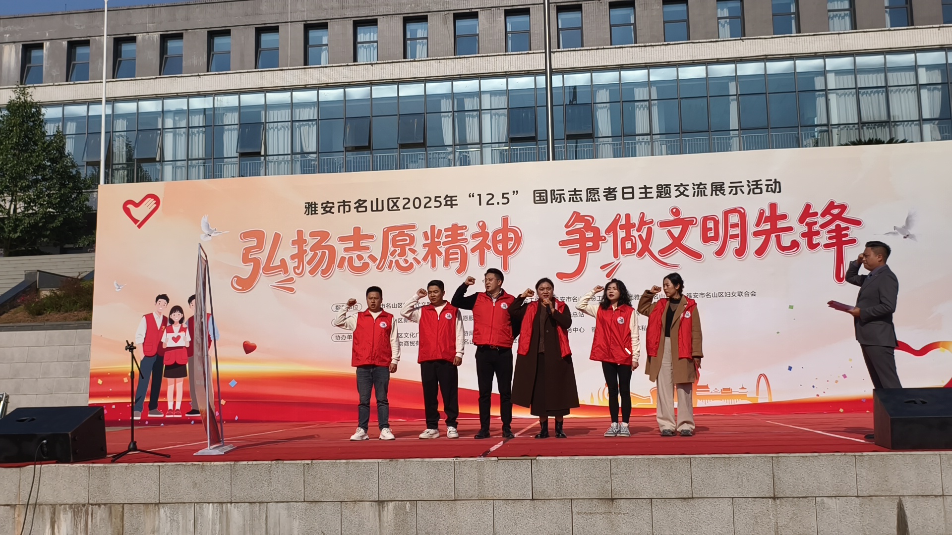 为深入学习贯彻落实党的二十届三中全会精神和习近平总书记关于志愿服务的重要论述,大力弘扬“奉献、友爱、互助、进步”的志愿精神,推动新时代文明实践志愿服务工作走深走实,12月5日,在第40个国际志愿者日到来之际,“弘扬志愿精神 争做文明先锋”主题交流展示活动在雅安市名山区文化广场隆重举行。