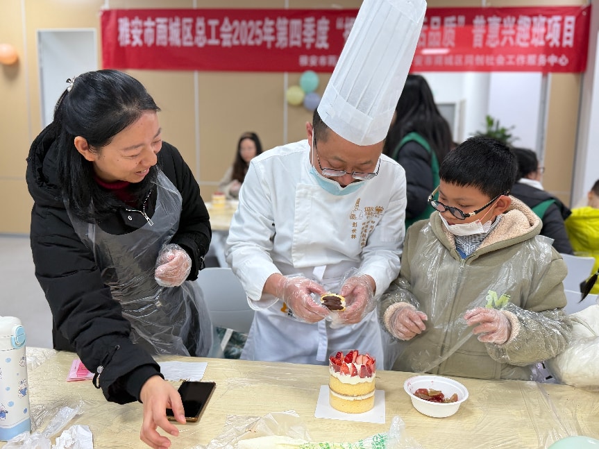 12月13日下午,由雨城区总工会精心策划、雨城区同创社会工作服务中心具体承办的“甜蜜时光·亲子蛋糕手作”沙龙主题活动在暖意融融的氛围中圆满举行。15对亲子家庭热情参与其中,共同体验了这场甜蜜的互动之旅。此次活动旨在创新服务形式,将工会的关怀延伸至职工家庭,通过亲子共作促进情感交融,构建和谐温馨的家庭文化。