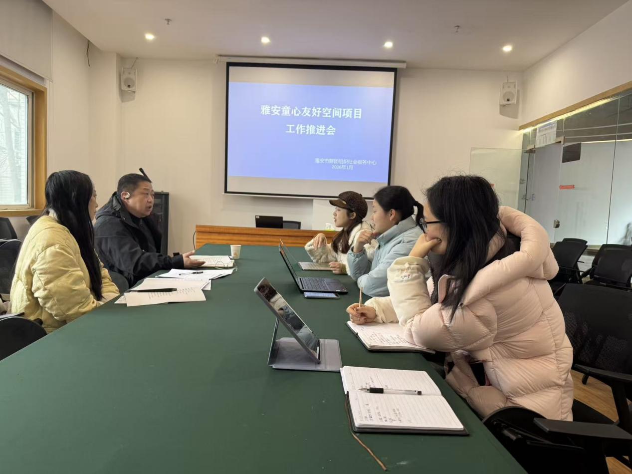 2026年1月15日,雅安市群团组织社会服务中心召开童心友好空间项目工作推进会,专题研究项目进展情况,部署下一阶段重点工作。市群团中心副主任刘雪松、团市委联络员郑丽、心漫漫心理工作室负责人岳苗及市群团中心项目部相关工作人员参加会议。