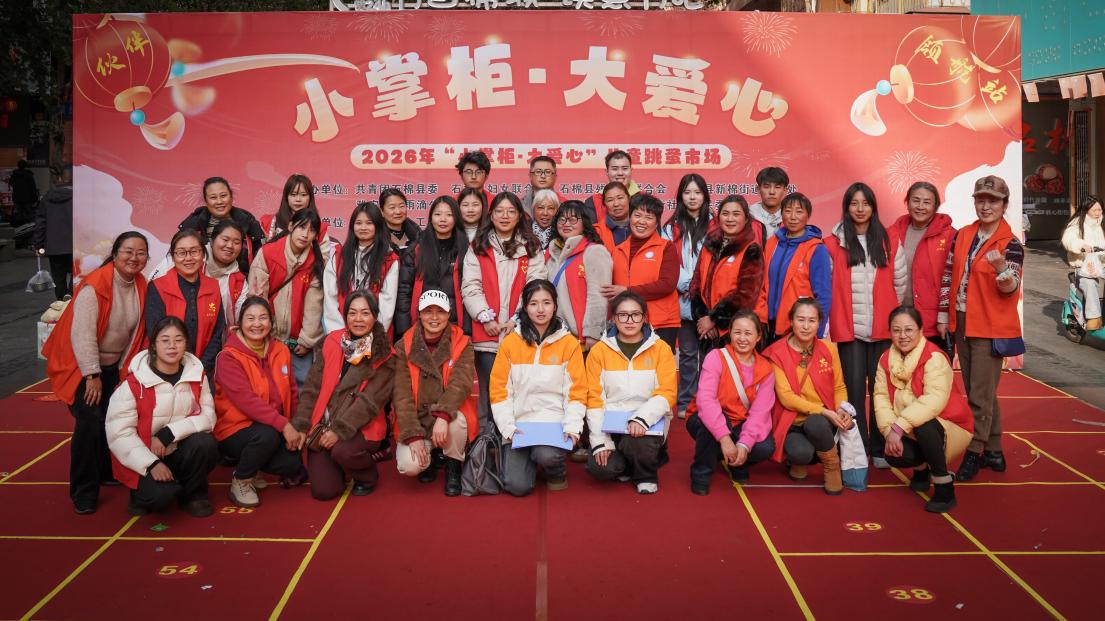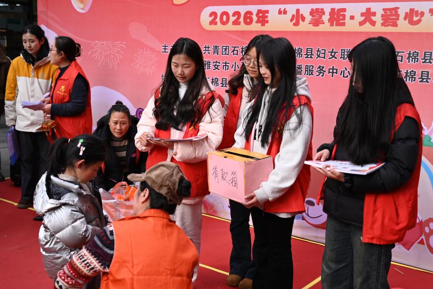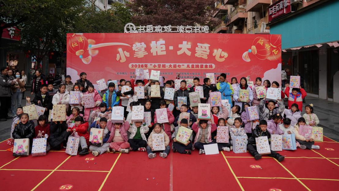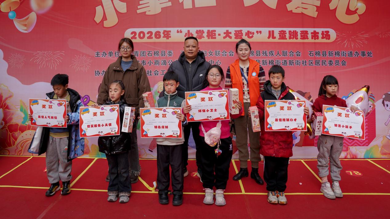 2026年1月31日,在冬日暖阳的映照下,石棉县步行街迎来了一场别开生面的“小掌柜·大爱心”儿童跳蚤市场活动。本次活动由共青团石棉县委、石棉县妇女联合会、石棉县残联、新棉街道办事处、雅安市公益传播服务中心、新街社区居民委员会共同支持主办,石棉县社会工作者协会协办,旨在为孩子们搭建一个展示自我、锻炼能力的平台,引导他们在实践中理解公益、践行爱心。活动当天吸引了80余名小朋友热情参与,创历史新高。为确保现场安全有序,石棉县社会工作者协会组织42名志愿者提供全程保障,现场气氛热烈而温馨。新棉街道党委委员、人武部部长邱健为活动致辞,新街社区党委书记冯兵宣布活动正式开始。